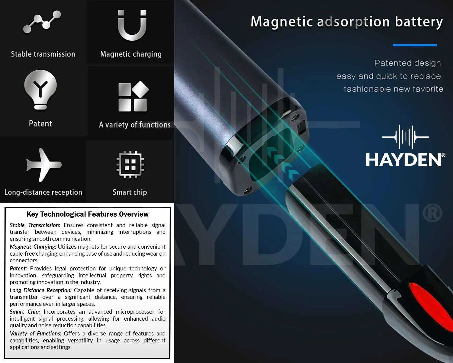 - 2-in-1 Base Module: Combines two microphones for simultaneous, versatile use.